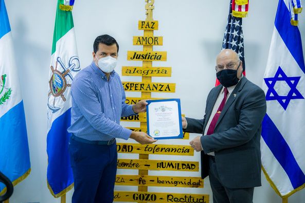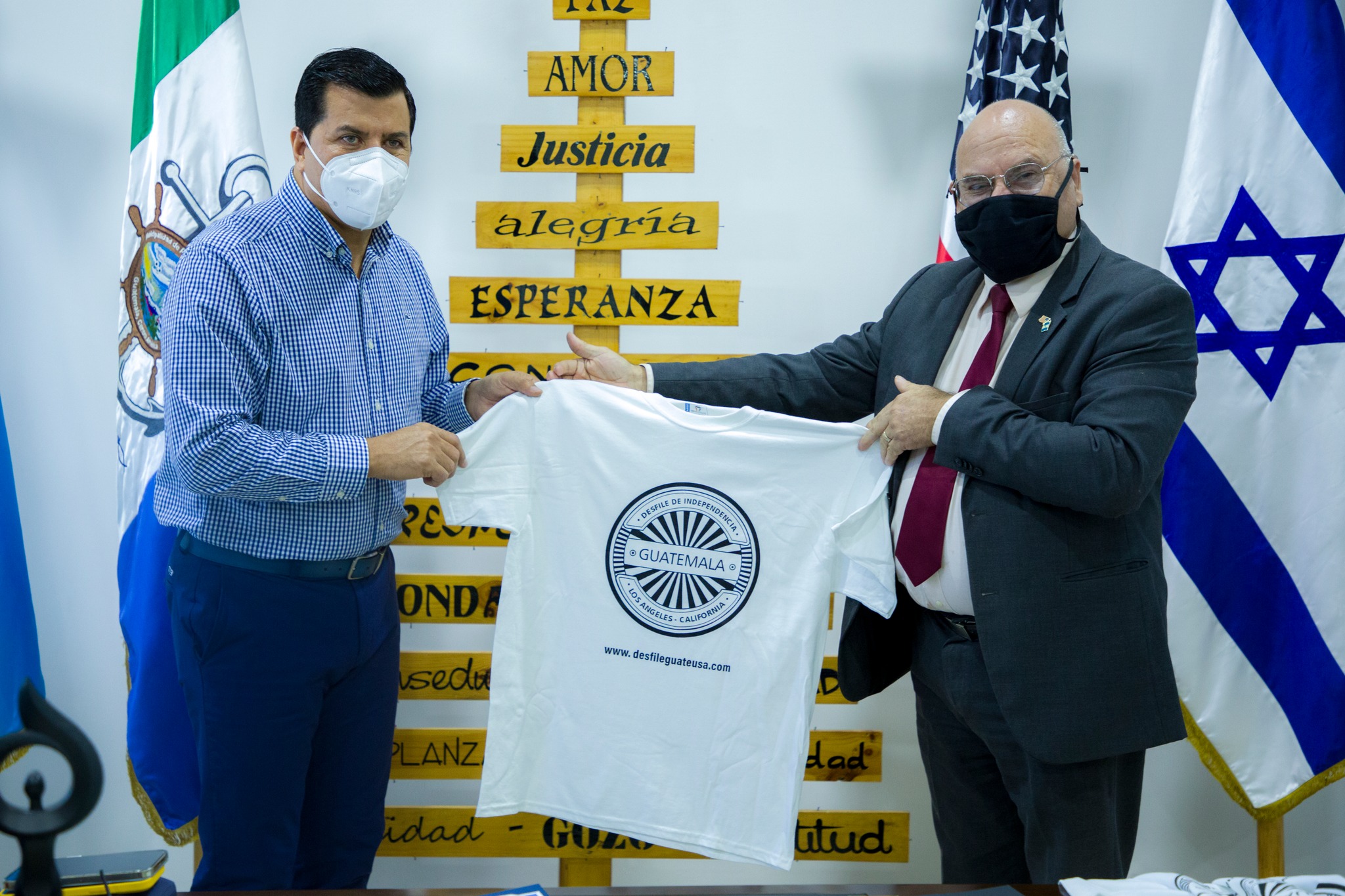 Este día el Alcalde Municipal, Lic. Hugo Sarceño recibió la visita de los Señores Rene Amiel Paniagua, Presidente de la Asociación de Migrantes Guatemaltecos en la ciudad de Los Ángeles y de Jairo Tacam, Representante de AMGLA Oficial para Guatemala y Centroamérica, quienes hicieron entrega de un Reconocimiento de Participación por la Conmemoración y Colaboración en el 1er. Desfile de Independencia de Guatemala en la Ciudad de Los Ángeles California, celebrado el pasado mes de septiembre.