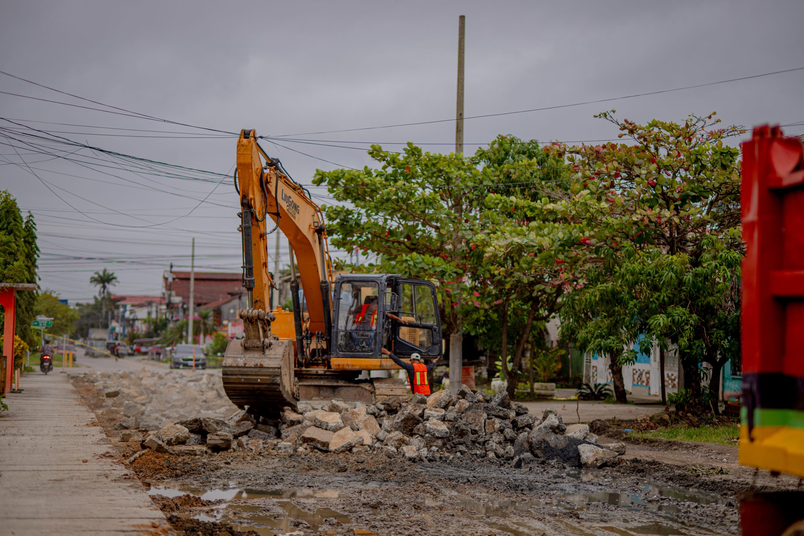 Se avanza de manera constante en los trabajos de construcción de la 13 calle que conduce al Muelle Municipal. El sistema de alcantarillado ya fue finalizado, dando paso a las labores con maquinaria pesada para levantar el cemento, como parte del proceso previo a la aplicación del concreto. Esta importante vía contará además con un área peatonal, pensada para brindar mayor seguridad a los transeúntes.