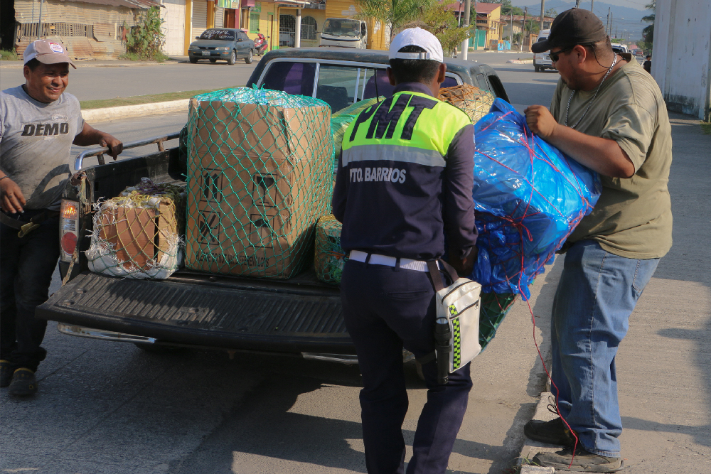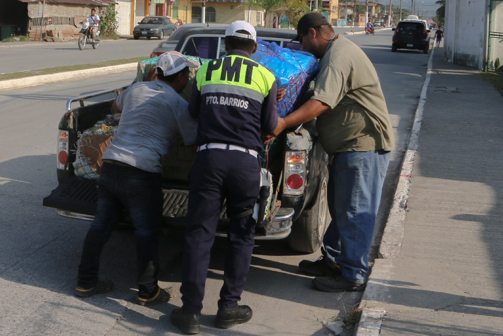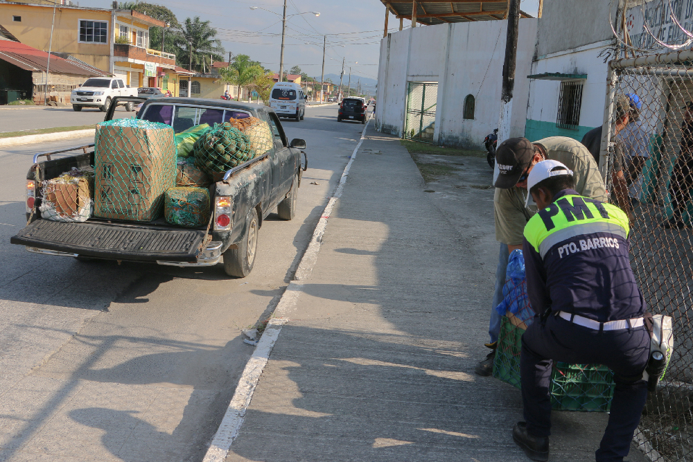 El conductor de un vehículo al que se le cayó una caja de fruta que transportaba recibió el auxilio oportuno de inmediato de un agente de la Policía Municipal de Transito que le ayudo a recuperar la caja y su contenido para que pudiera continuar su marcha después.