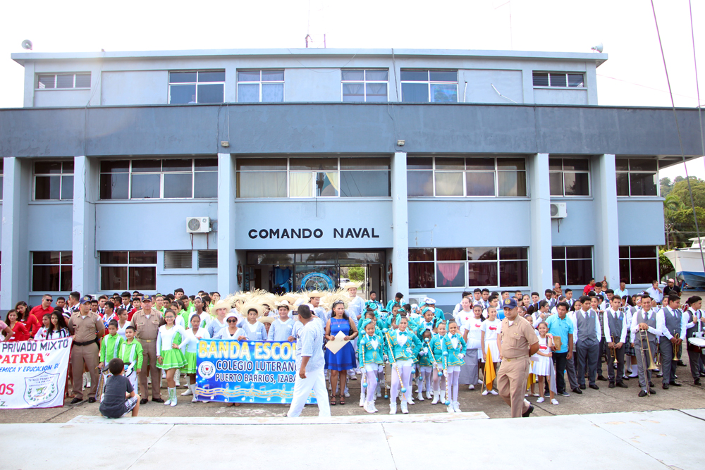 Diferentes establecimientos educativos continúan conmemorando el CXCVI Aniversario Patrio de Guatemala, a través del Concurso de Bandas, organizado por el Gobierno Municipal de Puerto Barrios y el Comando Naval del Caribe, quienes a través de sus representantes, la Licda. Alohita Gómez, Concejal VII y el Capitán de Navío Erick Sánchez Contreras brindaron palabras de agradecimientos a los establecimientos por su participación.