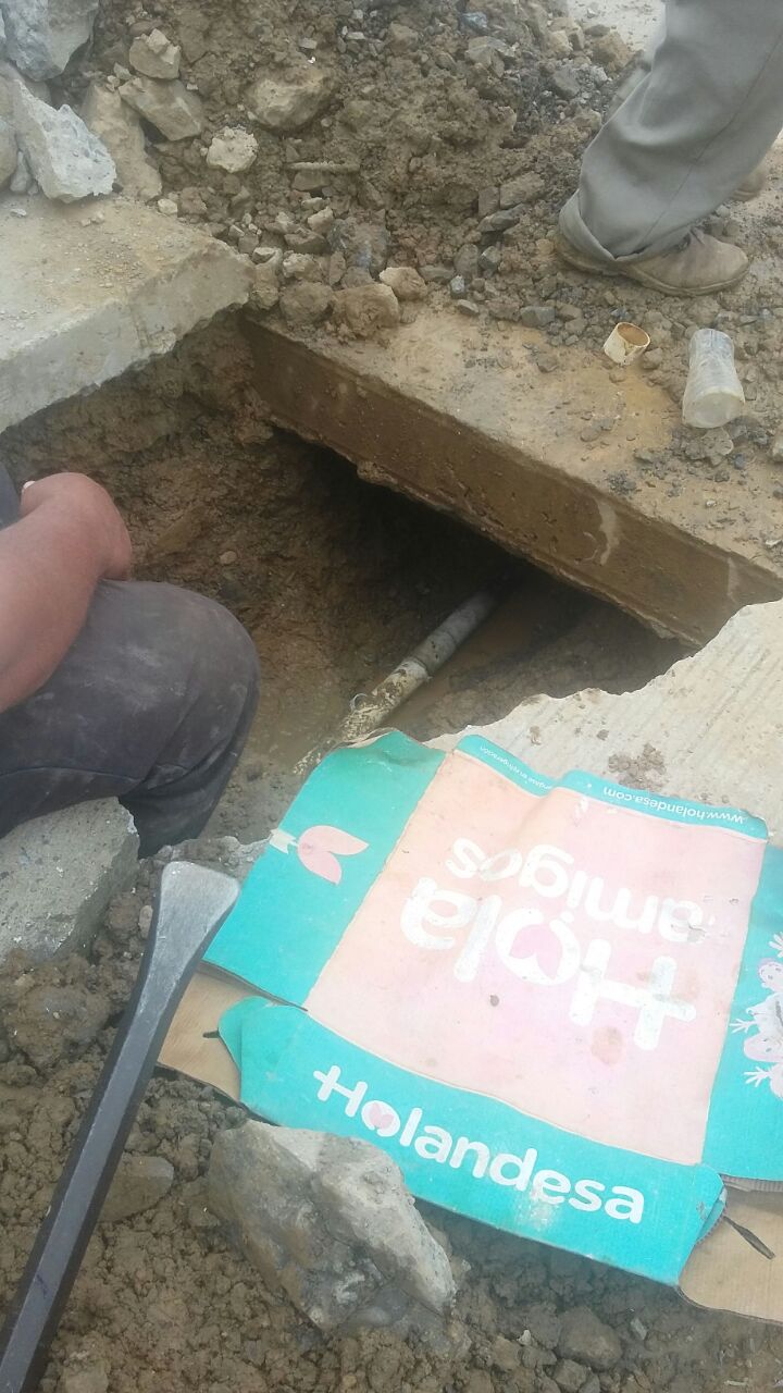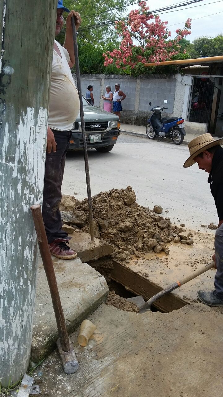 Se procedió a romper el concreto y constatando que la fuga estaba en la tubería de 2 pulgadas, después de los trabajos respectivos quedo solucionado el problema, por la pronta asistencia de los fontaneros municipales los vecinos quedaron muy agradecidos.