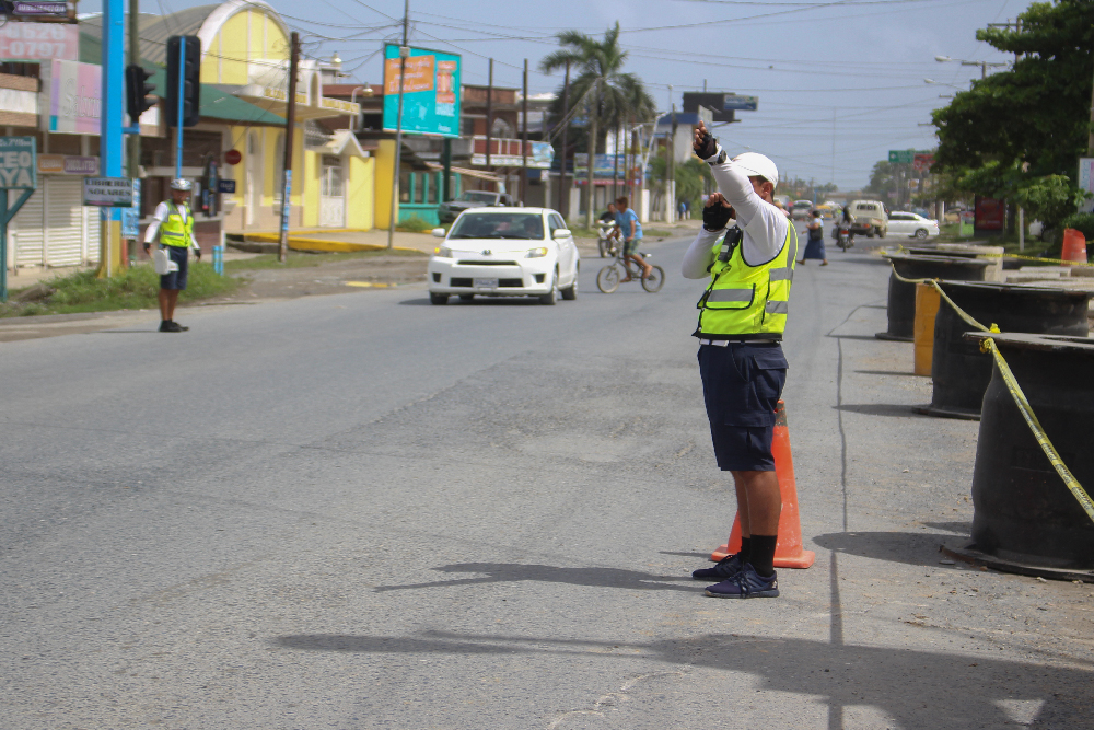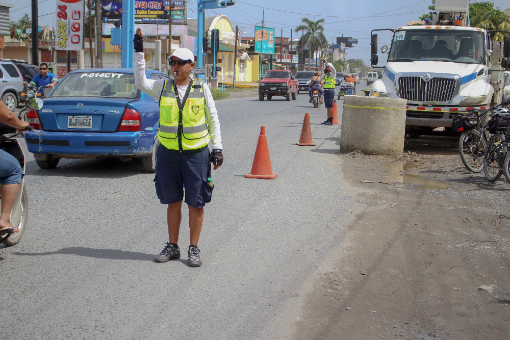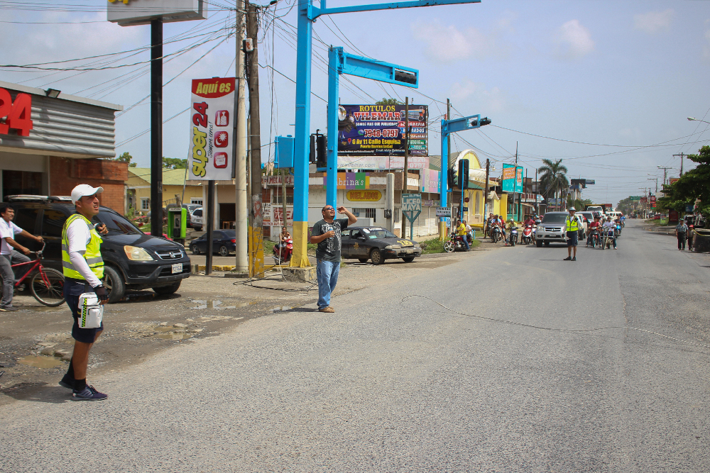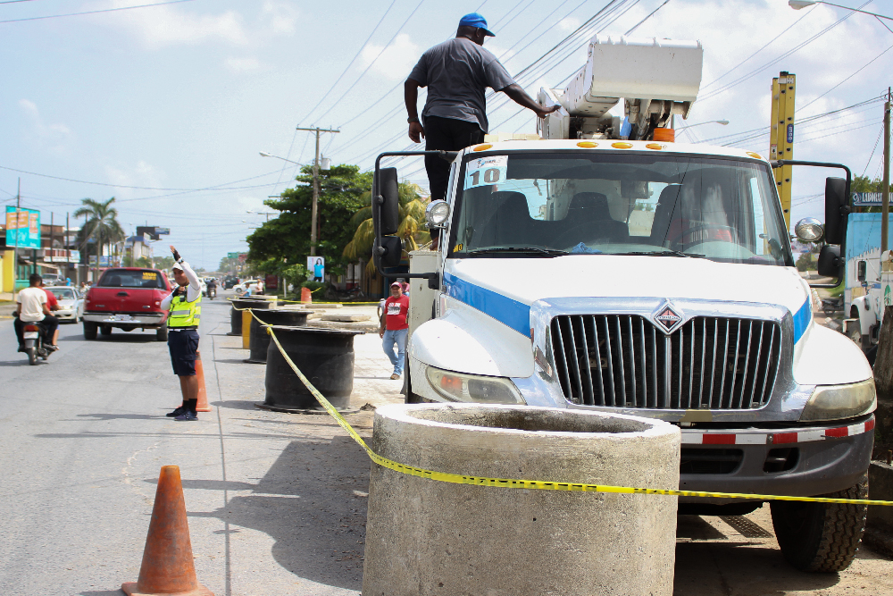 En la labor de sustitución del poste de alumbrado eléctrico que se realizó en la 22 calle y 12 avenida, se contó con la colaboración de los agentes de la Policía Municipal de Transito que se encargaron de controlar el tráfico de vehículos para prevenir cualquier accidente que pudiera afectar al personal de la Empresa Eléctrica Municipal que se encargó de realizar los trabajos.