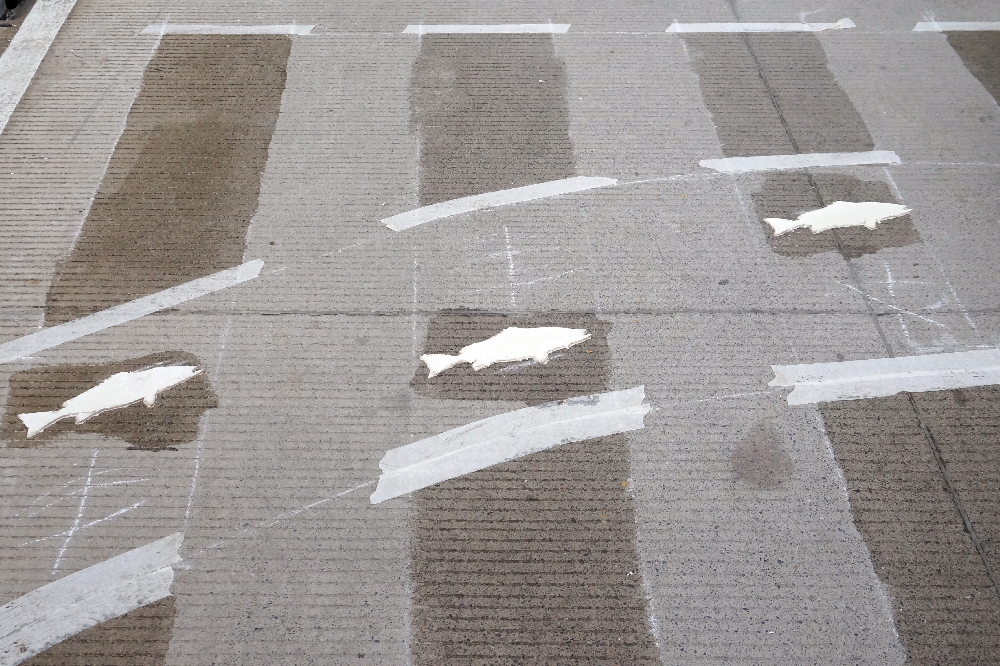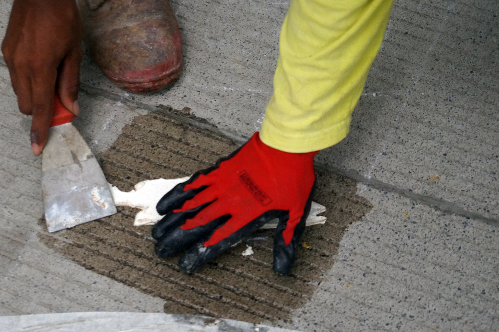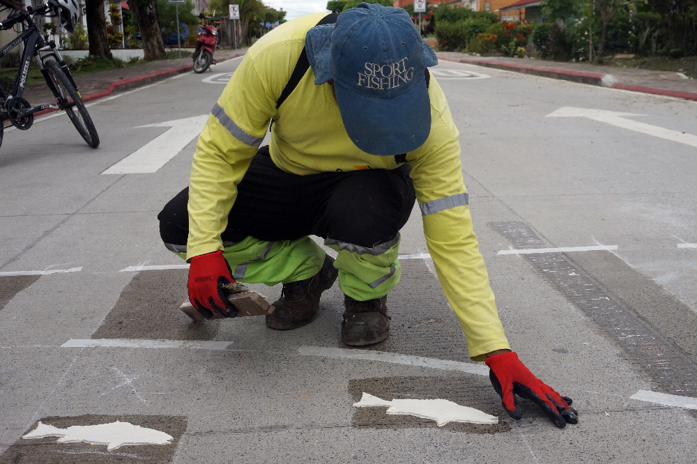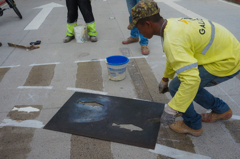 Esta mañana en la 11 calle, 11 y 12 avenidas se continúa colocando las señales de tránsito horizontales, las cuales consisten en marcas sobre el pavimento que sirven para regularizar y orientar la circulación de los vehículos, entre las cuales se podrán observar, flechas, líneas rojas, línea central discontinua, velocidad máxima y los pasos peatonales o pasos de cebras, estas últimas se complementan con imágenes de peces, piñas, cocos y palmeras, lo que brinda una particularidad de la Tierra de Dios.